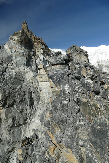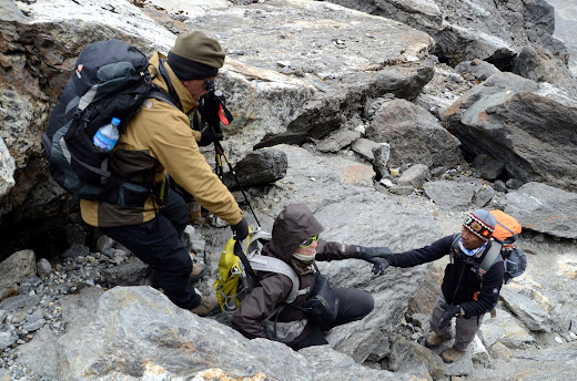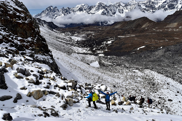 Спуск начинается по леднику. Верхняя часть спуска проходит по леднику, причём не по засыпавшим лёд камням, как это было при переходе Нгозумбы, а по чистому льду. Как правило, лёд шершав, и не всегда требует кошек. Другое дело, если уже ниже ледника на камнях замёрзнет вода. Тогда будут необходимы запасённые нами «котята».