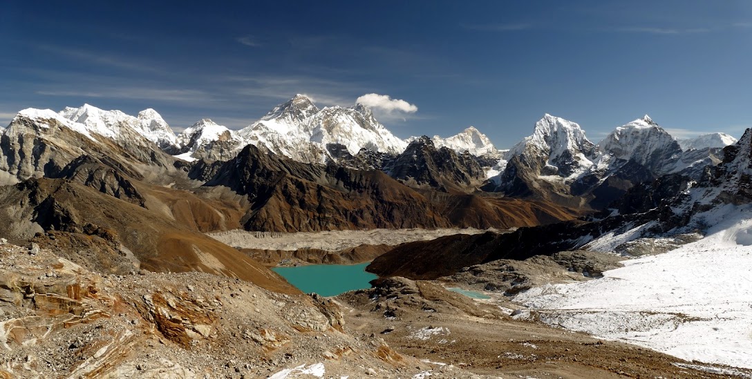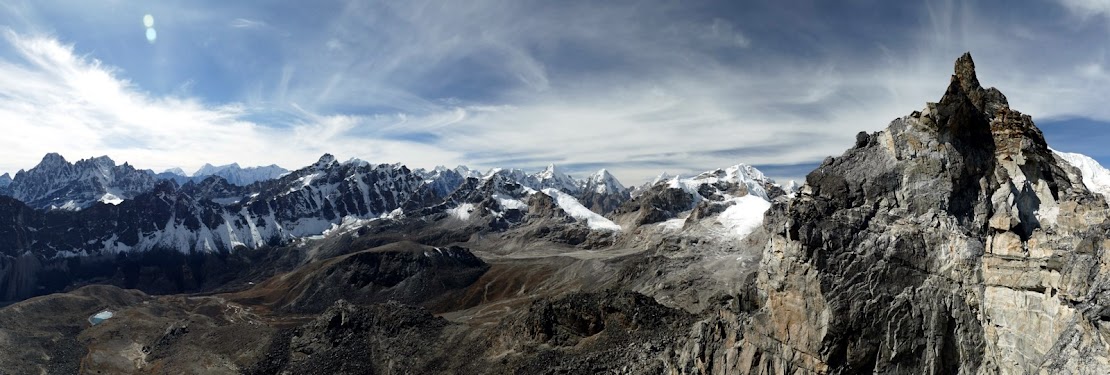 Чо Ла, без сомнения, самый популярный перевал в регионе Эвереста, так что сегодня наша группа гарантированно не останется без попутчиков. Все 8,5 км тропы с 700 м подъёма и таким же спуском мы будем делить с десятками треккеров, приехавших в Сагарматху со всего света. Пологий подход к подножью перевала займет 2,5-3 часа, ещё 1,5 крутой каменистый взлёт. Вид с вершины не такой, как на Ренджо, но кому и бриллианты мелковаты. Он всё равно впечатляет. На вершине привал и традиционное чаепитие.